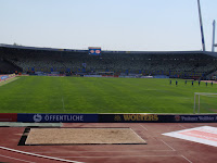We kamen 4 uur voor de wedstrijd aan, parkeerde onze wagen tactisch aan het stadion met de bedoeling ook snel weer weg te zijn. Na even de clubshop te hebben bezocht en de nodige prullaria in de wagen te hebben gelegd hadden we de bedoeling richting binnenstad te gaan maar toen vonden we net aan het stadion een soort wake board vijver met kunstmatig strand en drank/snack faciliteiten erbij wat ons een leuk alternatief leek, zeker met een 25 graden erbij. Maar toch even het oude stadion bezoeken dat enkele honderden meters verderop lag. Je kon hier zo binnen wandelen en vonden er ook een kroeg waar we binnen kwamen en blijkbaar de verzamelplaats was van de Wolfsburg ultras. We kregen wel enkele rare blikken naar ons (we vielen blijkbaar wel wat uit de ultra toon) maar toch bestelden we rustig iets om te drinken. Daarna terug naar de vijver waar we ons rustig in de stoeltjes nestelden en volop genoten van de aanwezige, brandende zon op mijn alleszins kale schedel toch.