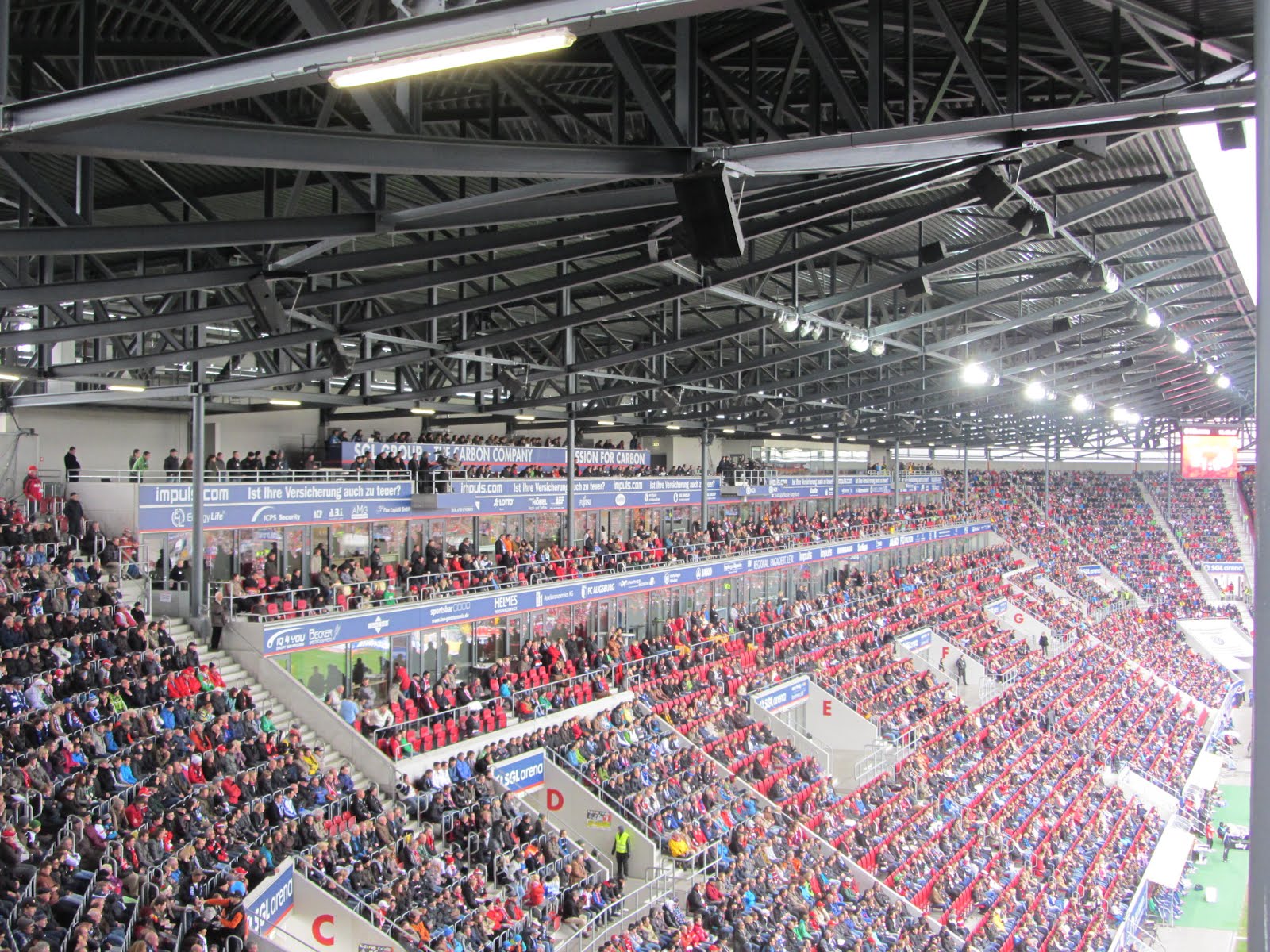 Dan maar naar binnen en ondanks de buitenkant me niet beviel vond ik het binnen dan weer een mooi modern voetbalstadion. Niet zo groot als de Allianz Arena maar toch goed voor een goede 30.000 toeschouwers. Mooi zo, als we nu nog een leuke wedstrijd voorgeschoteld zouden krijgen dan zat het allemaal weer meer dan goed. Schalke moest winnen voor de begeerde derde stek die recht geeft op Champions League deelname, Augsburg moest dan weer winnen om de degradatie te ontlopen.